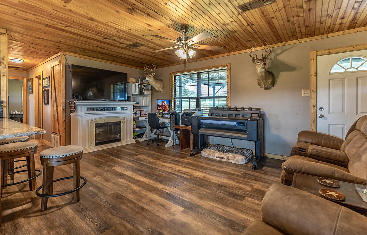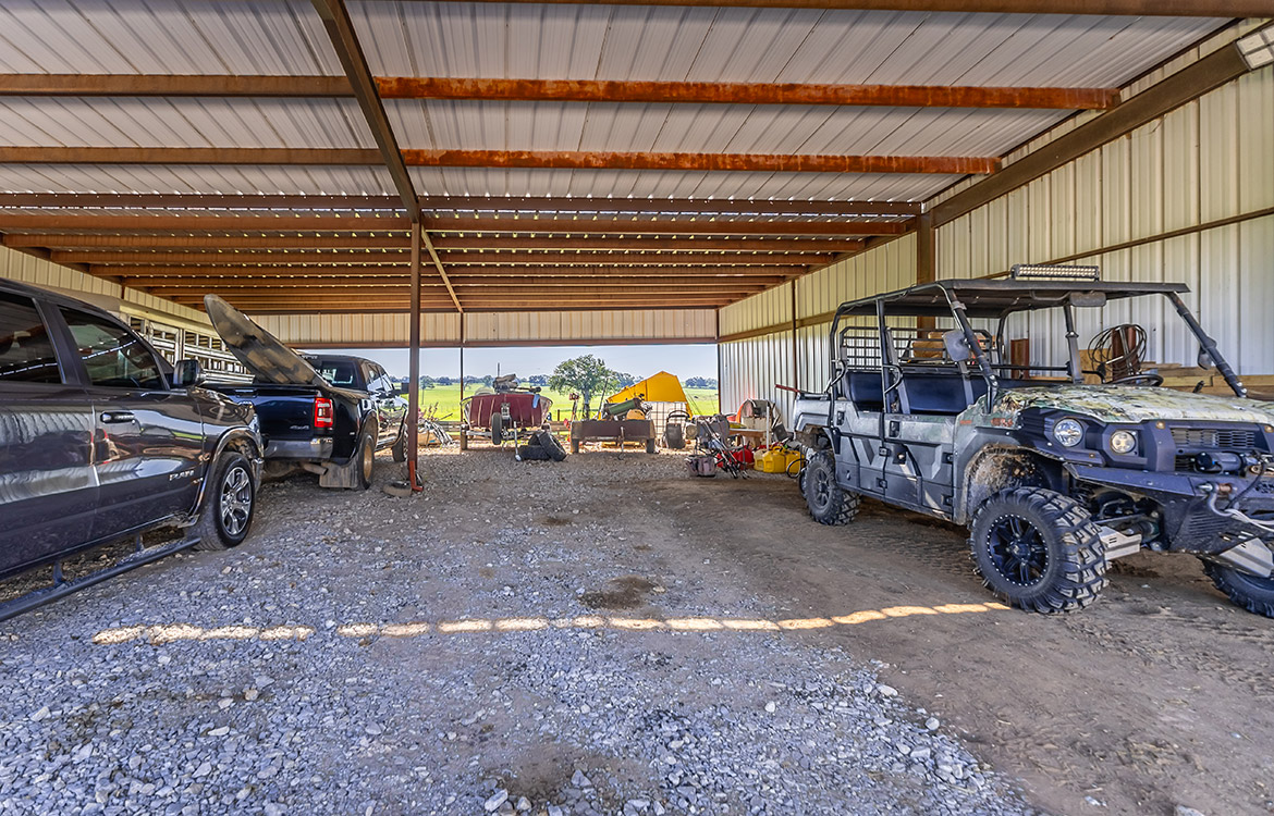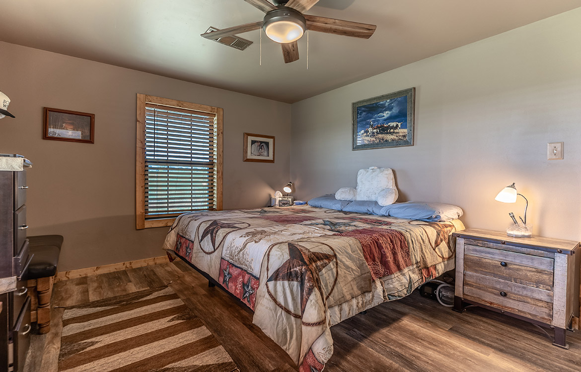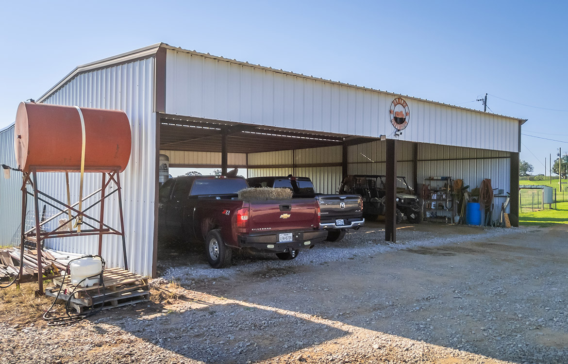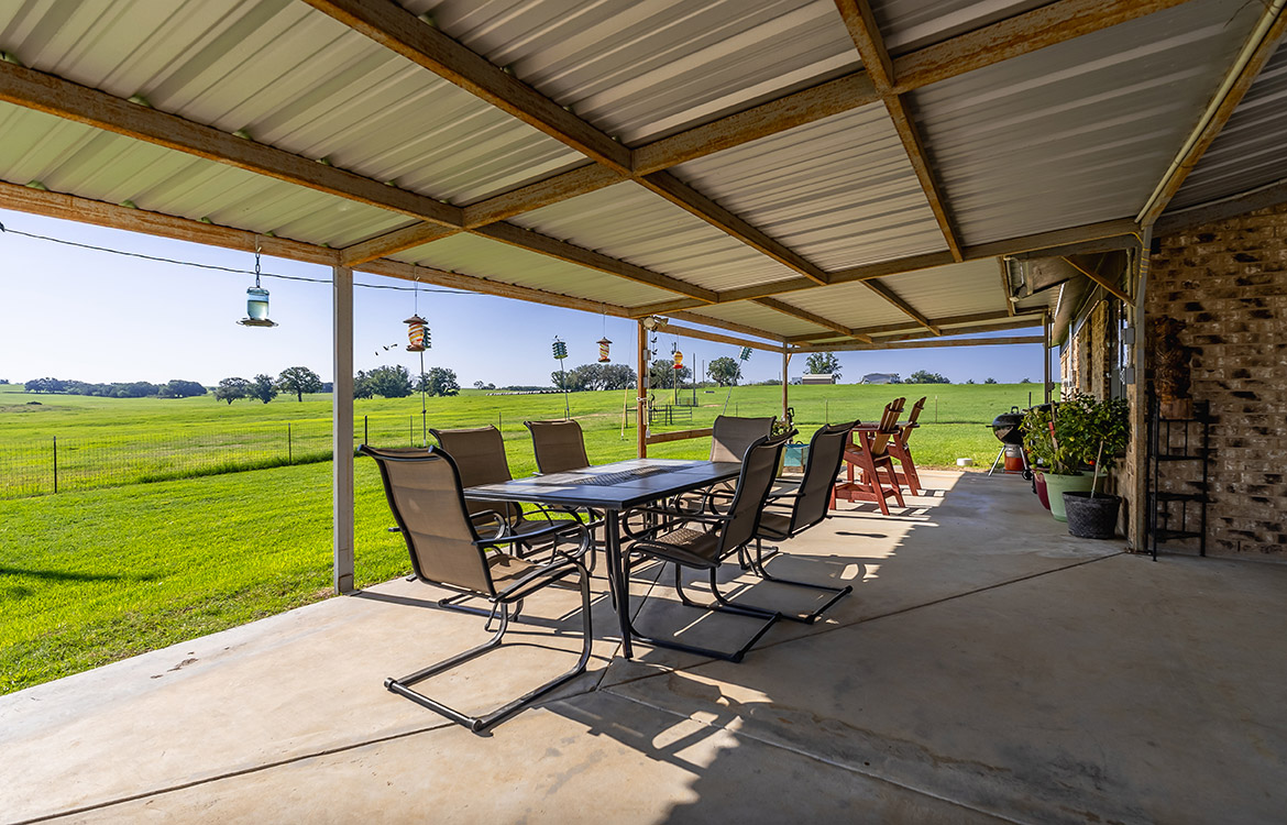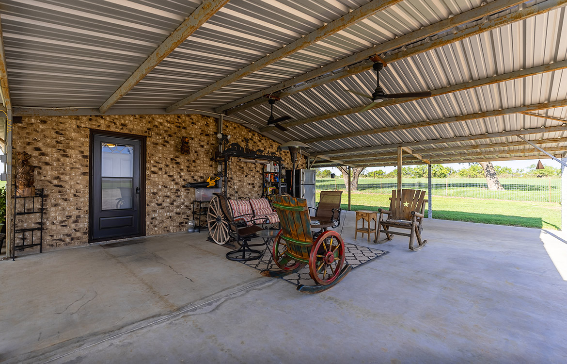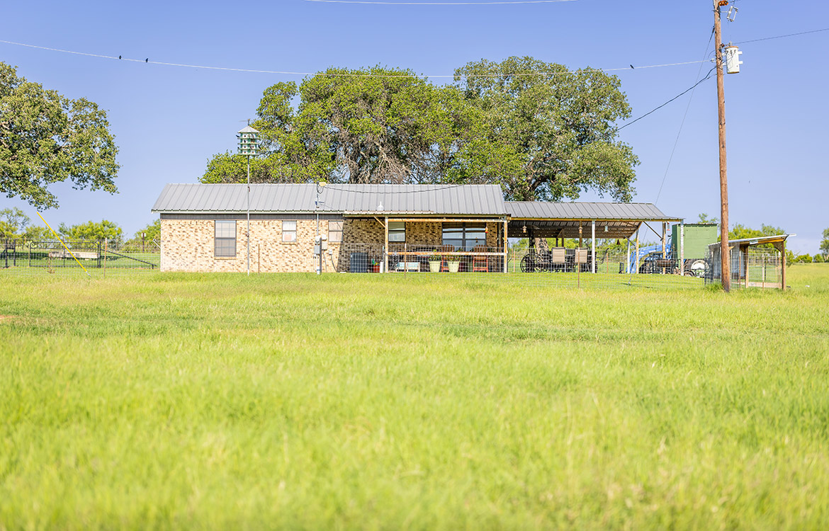 The property includes a 1,080± sq/ft brick house with two bedrooms and two bathrooms. Recent updates to the ceilings, floors, and bathrooms make the house move-in ready, while a covered front porch overlooks the pasture. A 3,000± sq/ft carport-style shop provides ample space for equipment, storage, or covered parking. A temperature-controlled doghouse and a fenced yard accommodate pets. Electricity is in place, and water is supplied by Richland Springs SUD. The ranch also maintains an agricultural exemption for reduced property taxes.