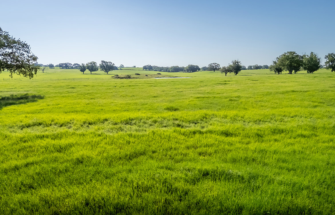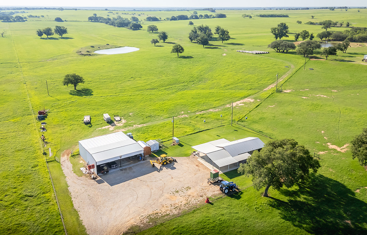 Scattered pecan trees, a coastal field, and wide-open views characterize the land. A caliche ranch road leads directly to the improvements, while ATV and riding trails extend across the property. The acreage is low-fenced and divided into three cross-fenced pastures, allowing for rotational grazing or other livestock management practices. A half-acre spring-fed pond and 468± feet of Limekiln Creek enhance the property’s natural beauty while supplying water for both wildlife and livestock.