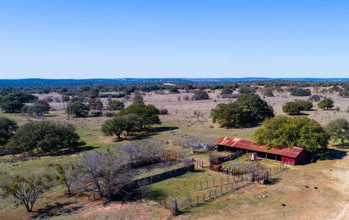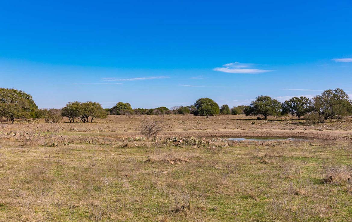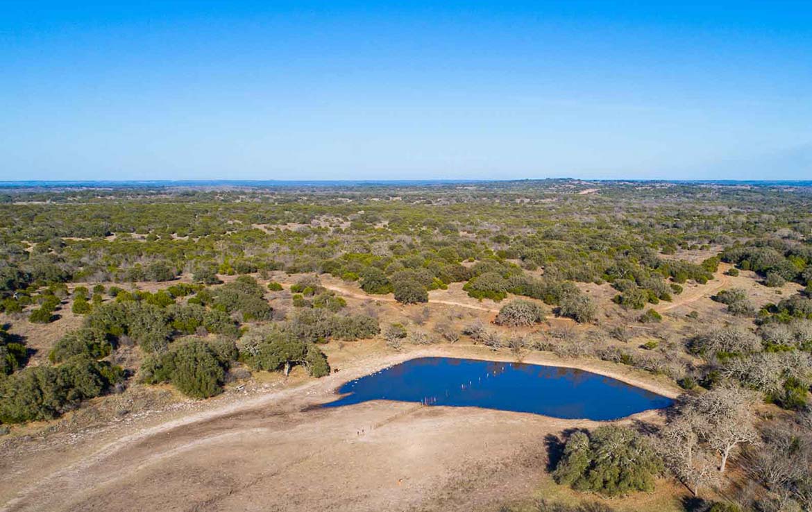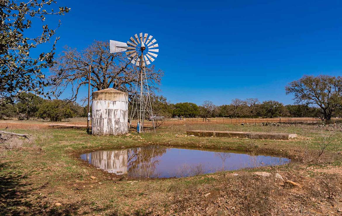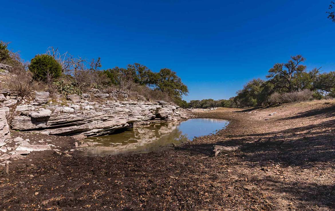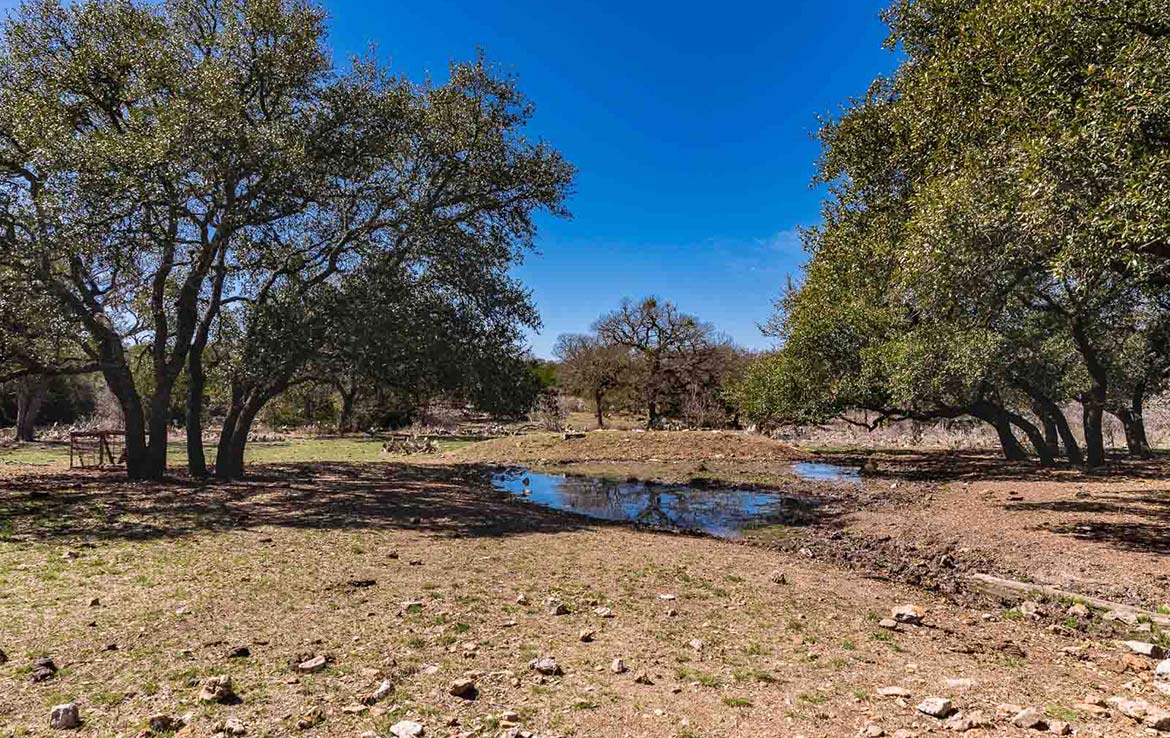The Marley Creek Ranch has 10 water wells and numerous troughs strategically placed in the ten low-fenced pastures. Five ponds around the ranch offer up watering holes for the livestock or wildlife. Wet weather Marley Creek carves a striking ravine, with some rocky banks and outcroppings, from east to west across the southern portion of the ranch.  Several smaller wet weather creeks and ponds feed into it and Marley Creek itself then feeds into Lake Buchanan about 10 miles downstream.