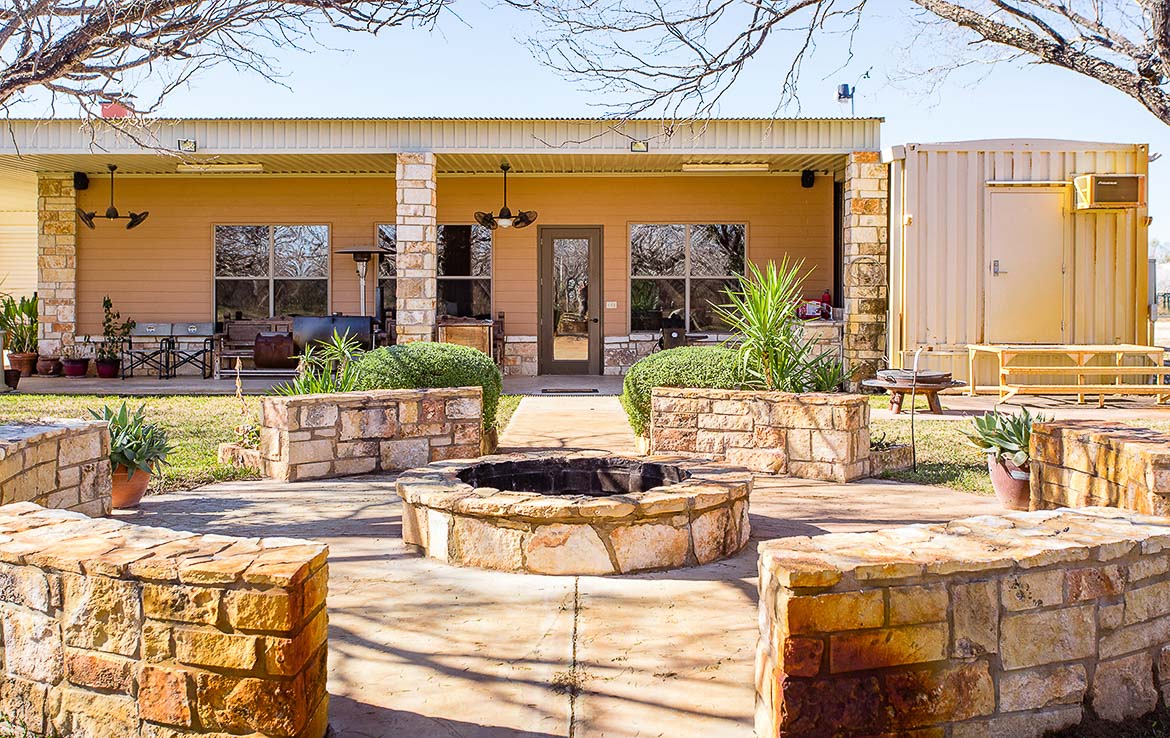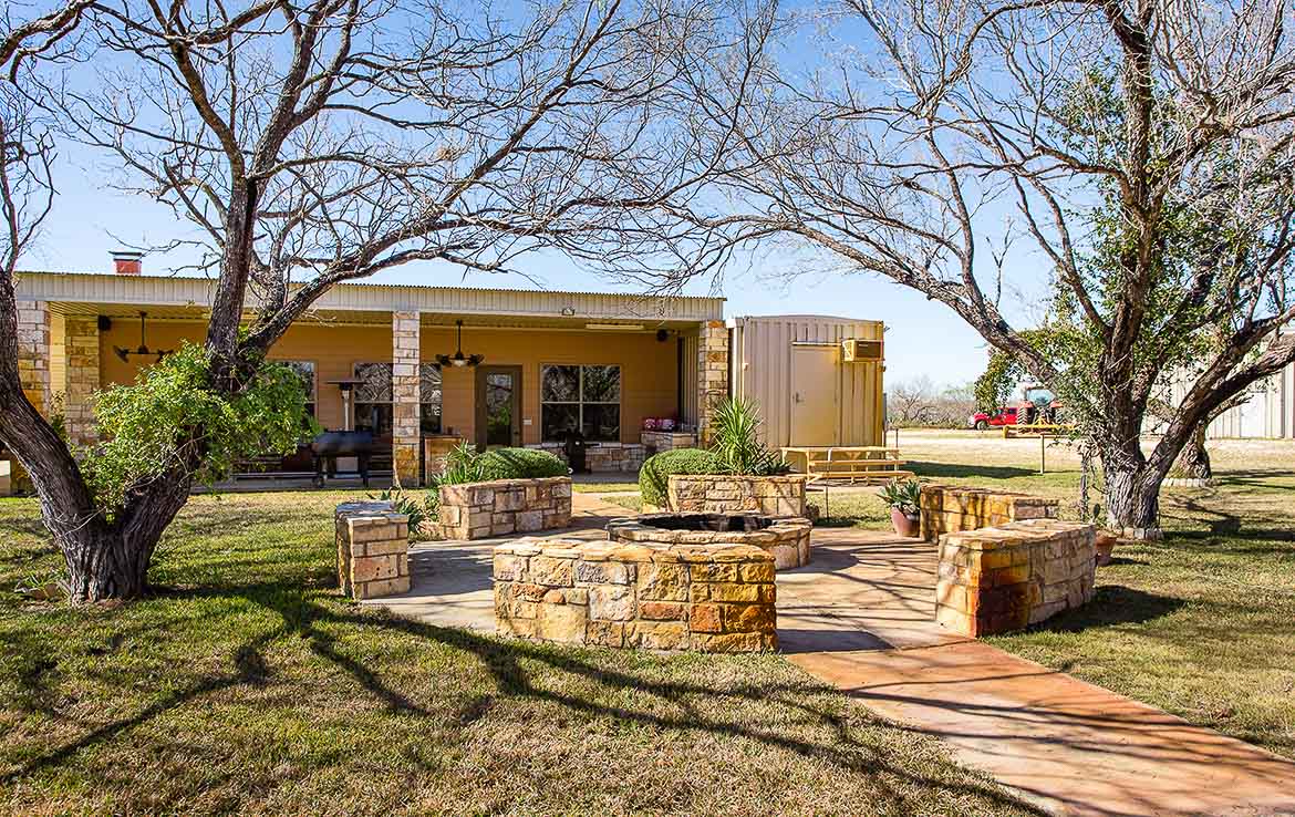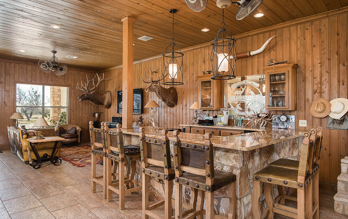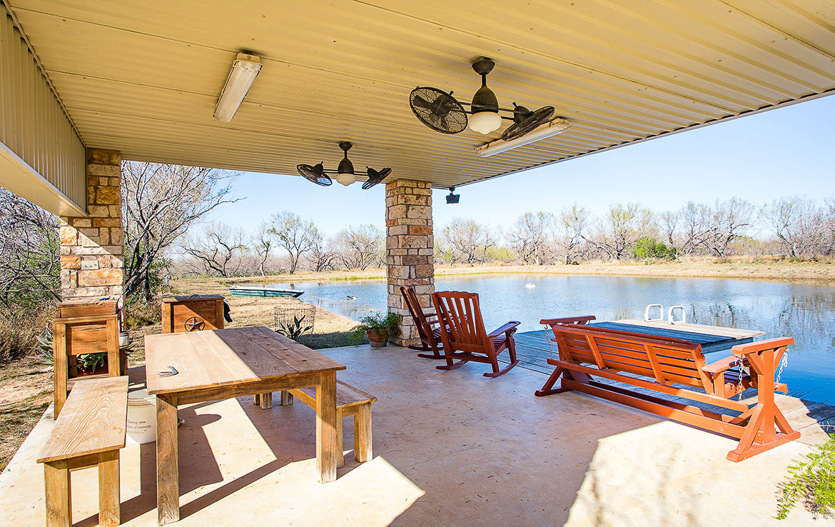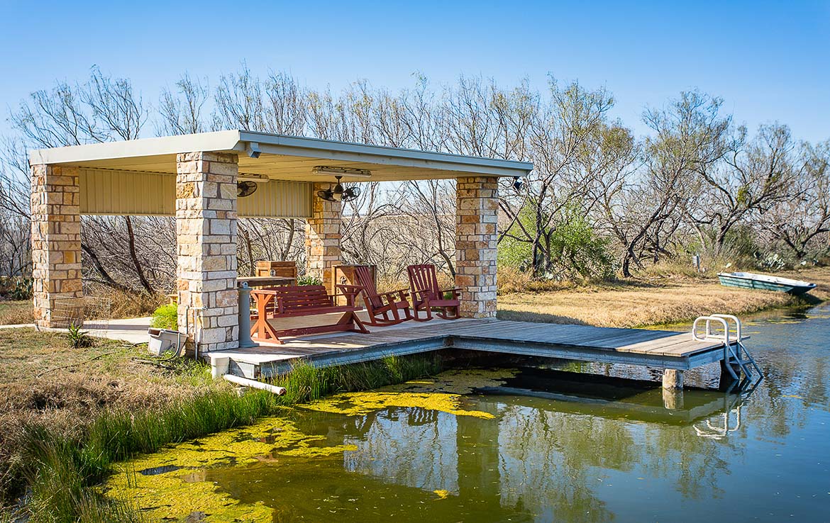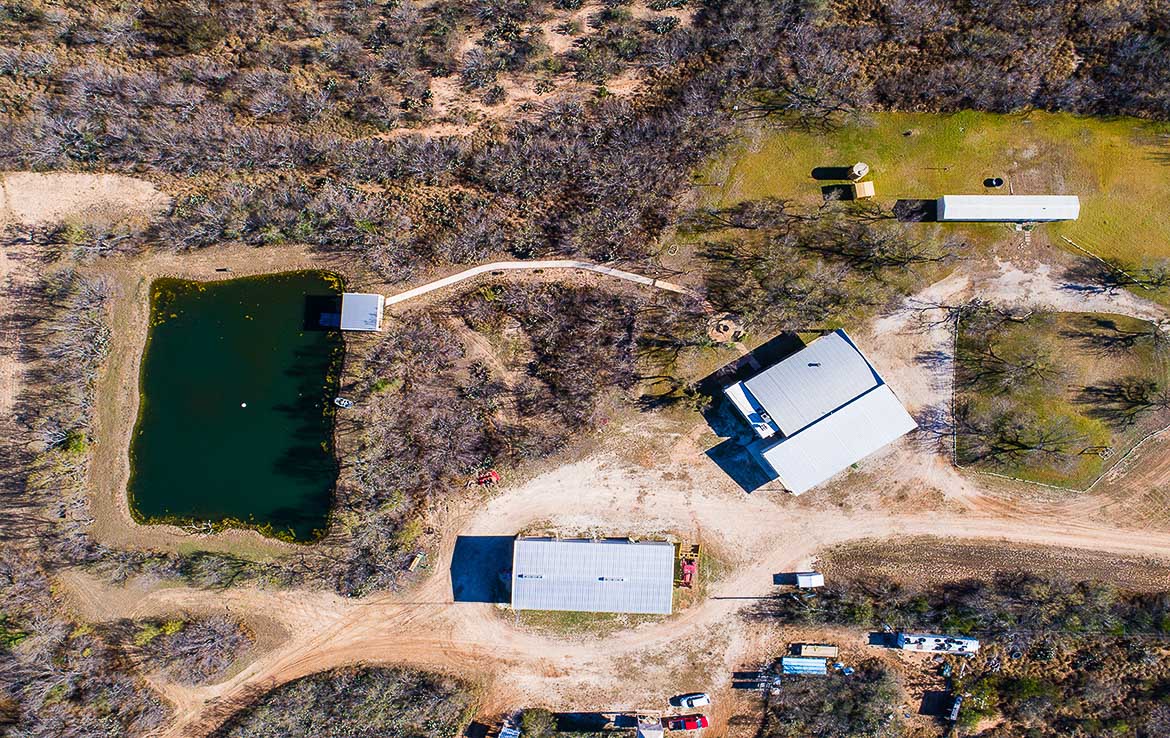 A beautiful electric gated entry leads to the headquarters area. Headquarters includes sleeping arrangements for up to 16 guests, along with several indoor and outdoor entertainment areas. Inside the main lodge is a great room complete with gourmet kitchen, wet bar, large dining areas, seating areas, and a stone fireplace. Behind the main lodge, a large liar’s pit has room for all guests to get cozy around the fire, and a paved sidewalk leads to the half-acre pond and pavilion. An extra mobile home is positioned near the lodge for overflow guests, and has an office for staff.